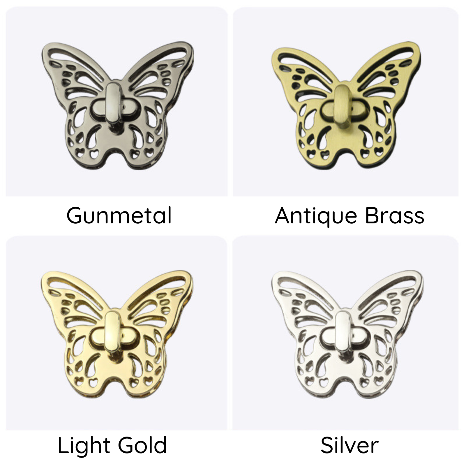 Regular price £5.50Butterfly twist lock for purse / clutch wallet making, 5 different colour finish - light gold, silver, gunmetal, antique brass and iridescent rainbow. There are perfect for bag makers looking for the professional finish for their bags.